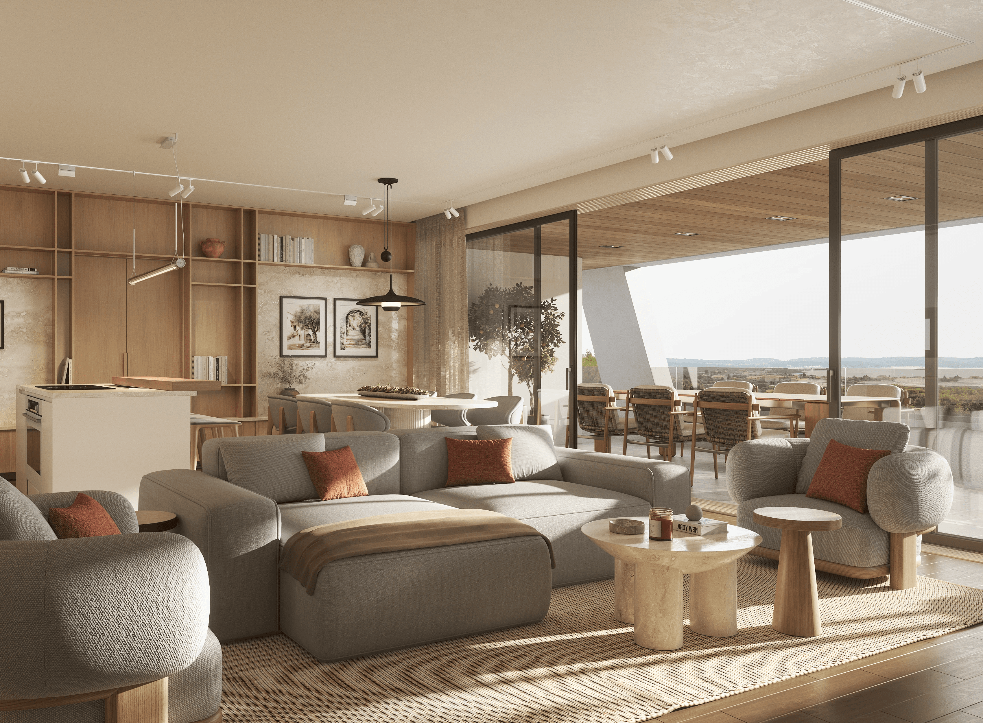 Organizacija prostora podređena je pogledu: stambene jedinice orijentirane su prema moru, s naglaskom na otvorene dnevne prostore i prostrane terase koje produžuju boravak prema eksterijeru. Velike staklene plohe brišu granicu između unutarnjeg i vanjskog prostora, dok luksuzni materijali dodatno naglašavaju kvalitetu stanovanja.