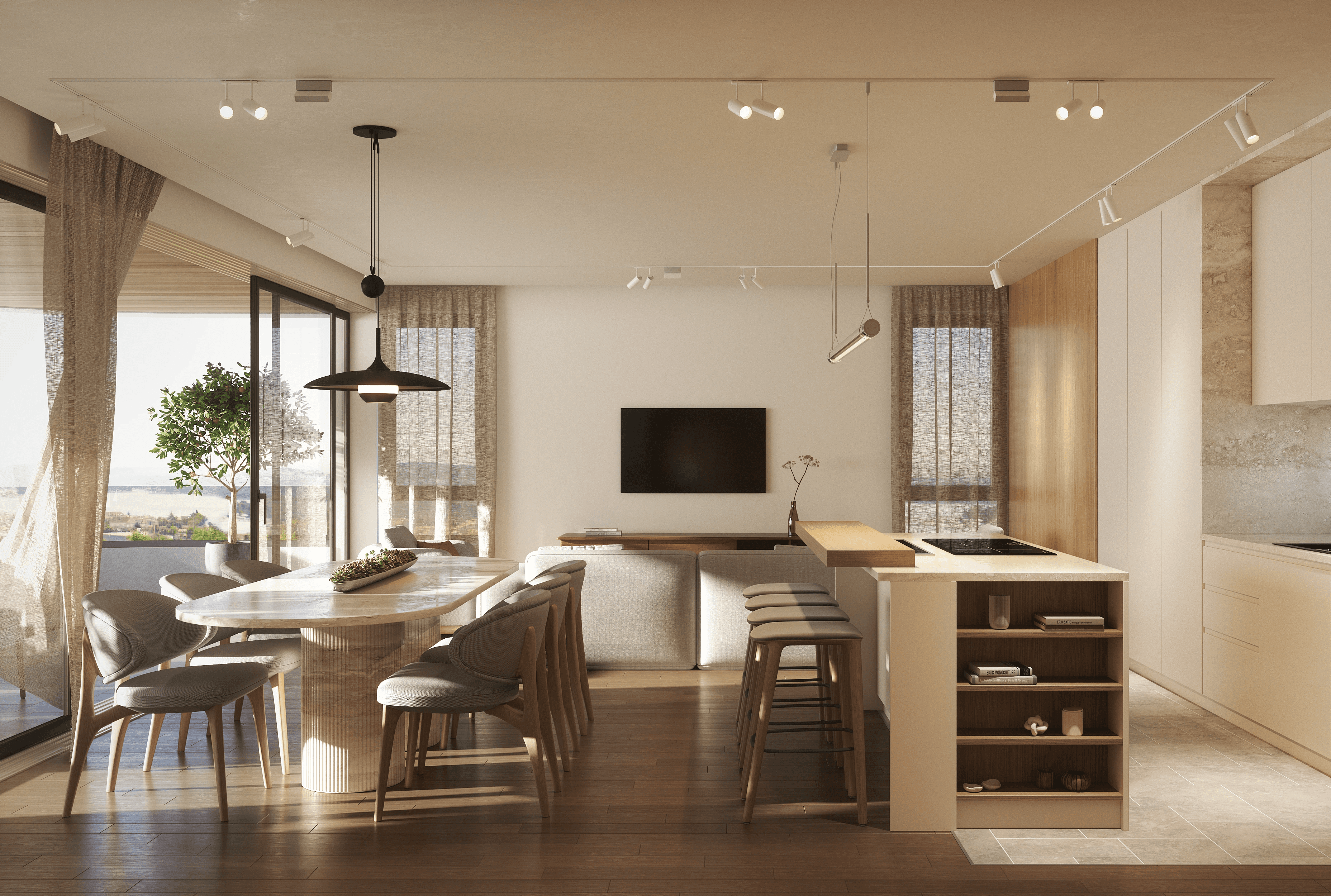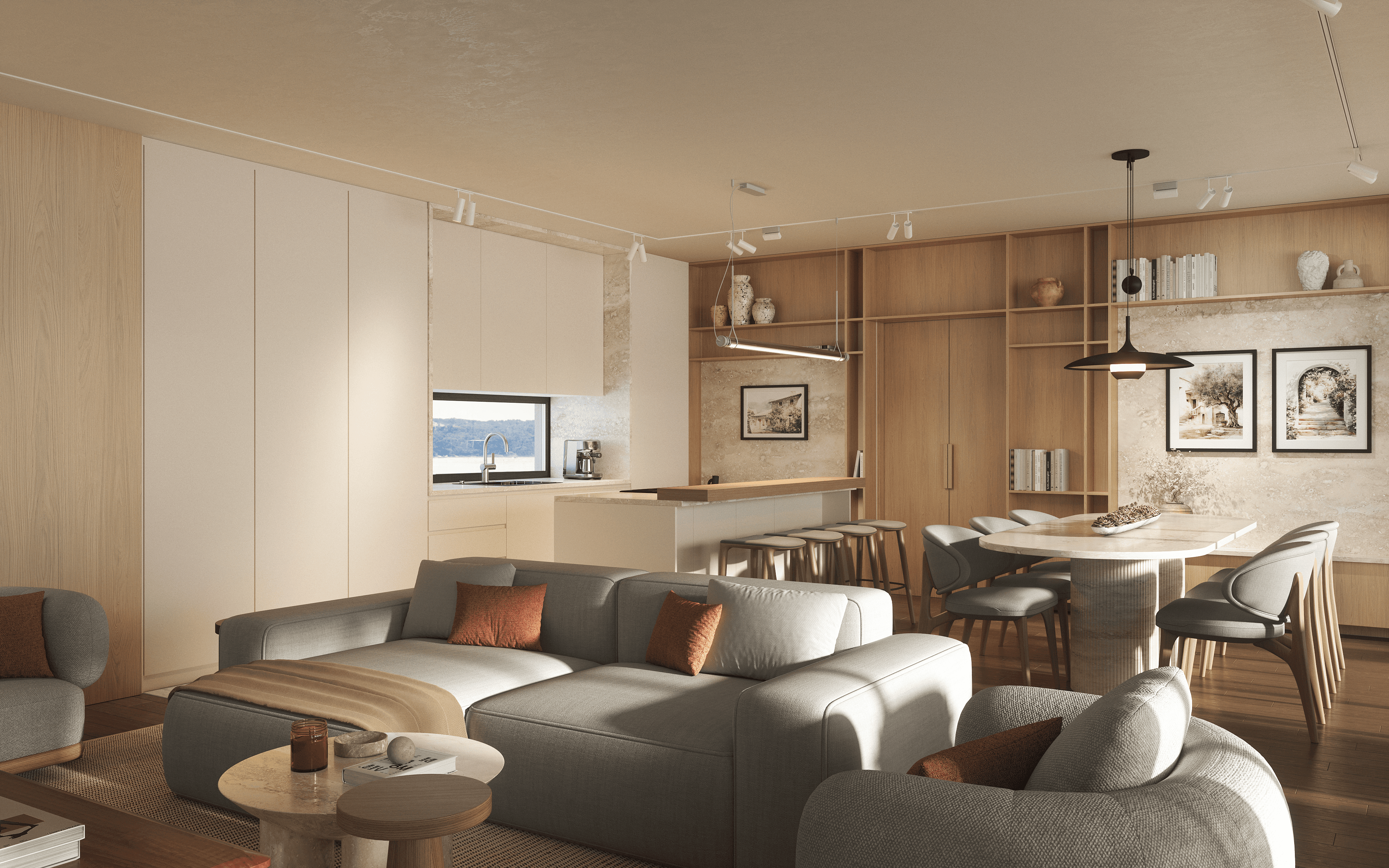U sklopu projekta osmišljen je i cjelovit interijer u japandi stilu, koji uvodi smiren, topao i suptilno minimalistički karakter unutarnjih prostora. Dok je eksterijer definiran modernim, preciznim i dinamičnim arhitektonskim izrazom, interijer gradi suprotnu, ali komplementarnu atmosferu — kroz prirodne materijale, meke tonove i pročišćene detalje. Ova dualnost između snažnog suvremenog volumena i tihog, uravnoteženog interijera stvara cjelovito iskustvo stanovanja, u kojem se arhitektura i interijer međusobno nadopunjuju i pojačavaju identitet projekta.